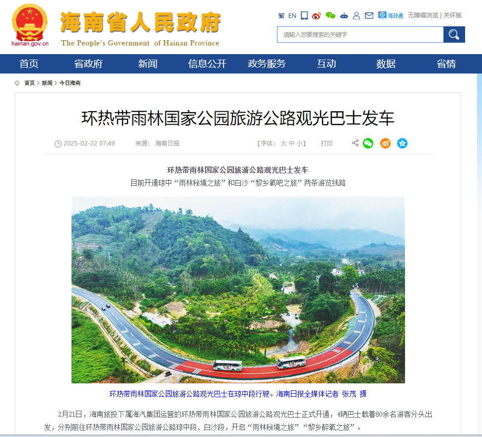 近日,海南日報頭版、02版雙版報道海南旅投開通環(huán)熱帶雨林國家公園旅游公路觀光巴士(以下簡稱“環(huán)熱旅游公路觀光巴士”)。此外,新華網(wǎng)、人民網(wǎng)、海南發(fā)布、海南新聞聯(lián)播、南海網(wǎng)、三沙衛(wèi)視等媒體集中報道,海南省人民政府網(wǎng)、海南國資政務平臺轉發(fā),媒體發(fā)布相關短視頻累積閱讀量破2萬。