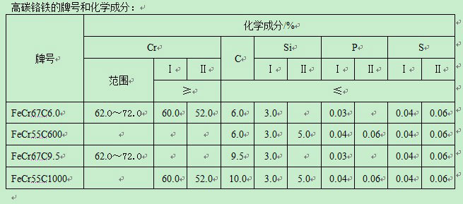 高碳鉻鐵主要用于不銹鋼生產,其中200系不銹鋼含鉻量約在16%,300系不銹鋼含鉻量約在25%,400系不銹鋼含鉻量約在14%。鉻鐵需求量大的300系不銹鋼也是不銹鋼生產中大比例的產品。 用作含碳較高的滾珠鋼、工具鋼和高速鋼的合金劑,提高鋼的淬透性,增加鋼的耐磨性和硬度;用作鑄鐵的添加劑,改善鑄鐵的耐磨性和提高硬度,同時使鑄鐵具有良好的耐熱性;用作無渣法生產硅鉻合金和中、低、微碳鉻鐵的含鉻原料;用作電解法生產金屬鉻的含鉻原料;用作吹氧法冶煉不銹鋼的原料。 高碳鉻鐵的冶煉方法有高爐法、電爐法、等離子爐法等。使用高爐只能制得含鉻在30%左右得特種生鐵。截至2012年,含鉻高的高碳鉻鐵大都采用熔劑法在礦熱爐內冶煉。 電爐法冶煉高碳鉻鐵的基本原理是用碳還原鉻礦中鉻和鐵的氧化物。碳還原氧化鉻生成Cr2C2的開始溫度為1373K,生成Cr7C3的反應開始溫度1403K,而還原生成鉻的反應開始溫度為1523K,因而在碳還原鉻礦時得到的是鉻的碳化物,而不是金屬鉻。鉻鐵中含碳量的高低取決于反應溫度。生成含碳量高的碳化物比生成含碳量低的碳化物更容易。